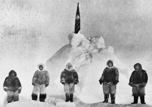 Sebuah foto dengan gambar dua orang lelaki bermantel bulu tebal sedang berdiri di atas padang salju. Tampak pula…